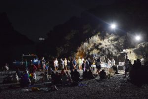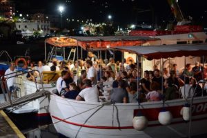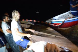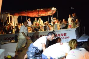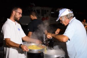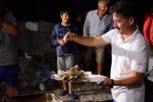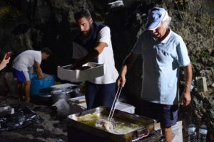 Ora è praticamente un cono ribaltato. Dentro ci può essere di tutto, ma per scoprirlo bisogna avvalersi delle forza e delle esperienza dei lupi di mare. In cinque tirano sopra la rete. Ci vuole qualche minuto. Intanto dai barconi i turisti assistono ad uno spettacolo mozzafiato e, se fortunati, in compagnia di una luna piena bellissima. I capitani delle barche, e i loro aiutanti, spiegano tecniche e storia di questo tipo di pesca che è diventato un’attrazione per i turisti. Giampaolo, Ciro, Marco, Leonardo e Federico intrattengono famiglie, giovani e anziani con spiegazioni e domande. E, tra una curiosità e l’altra, ecco che la rete è quasi tutta sull’imbarcazione e il pesce azzurro è pronto per essere catturato con l’aiuto di un guadino. Il pescato viene sistemato nelle cassette e portato sulla spiaggia insieme ai turisti. Dieci chili di spaghetti, venti chili di frittura, dieci litro di vino bianco e quattro angurie: il banchetto è servito. E qui è proprio il caso di dirlo: pescato, cotto e mangiato. Dopo cena c’è chi si tuffa in mare, chi allieta gli ospiti con il suono della chitarra. Poi un selfie con i pescatori e i barcaioli e si ritorna al porto consapevoli di aver trascorso una notte magica che rimarrà per sempre tale.